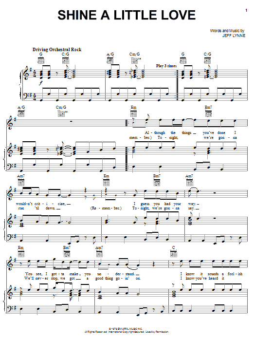 Download or print Electric Light Orchestra Shine A Little Love sheet music, chords and digital score arranged for Piano, Vocal & Guitar Chords (Right-Hand Melody). This Pop score includes 8 page(s).