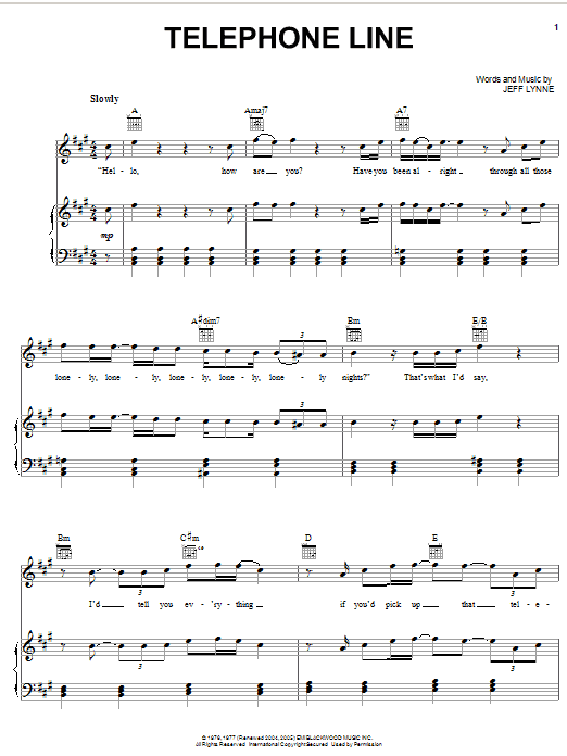 Download or print Electric Light Orchestra Telephone Line sheet music, chords and digital score arranged for Piano, Vocal & Guitar Chords (Right-Hand Melody). This Pop score includes 5 page(s).