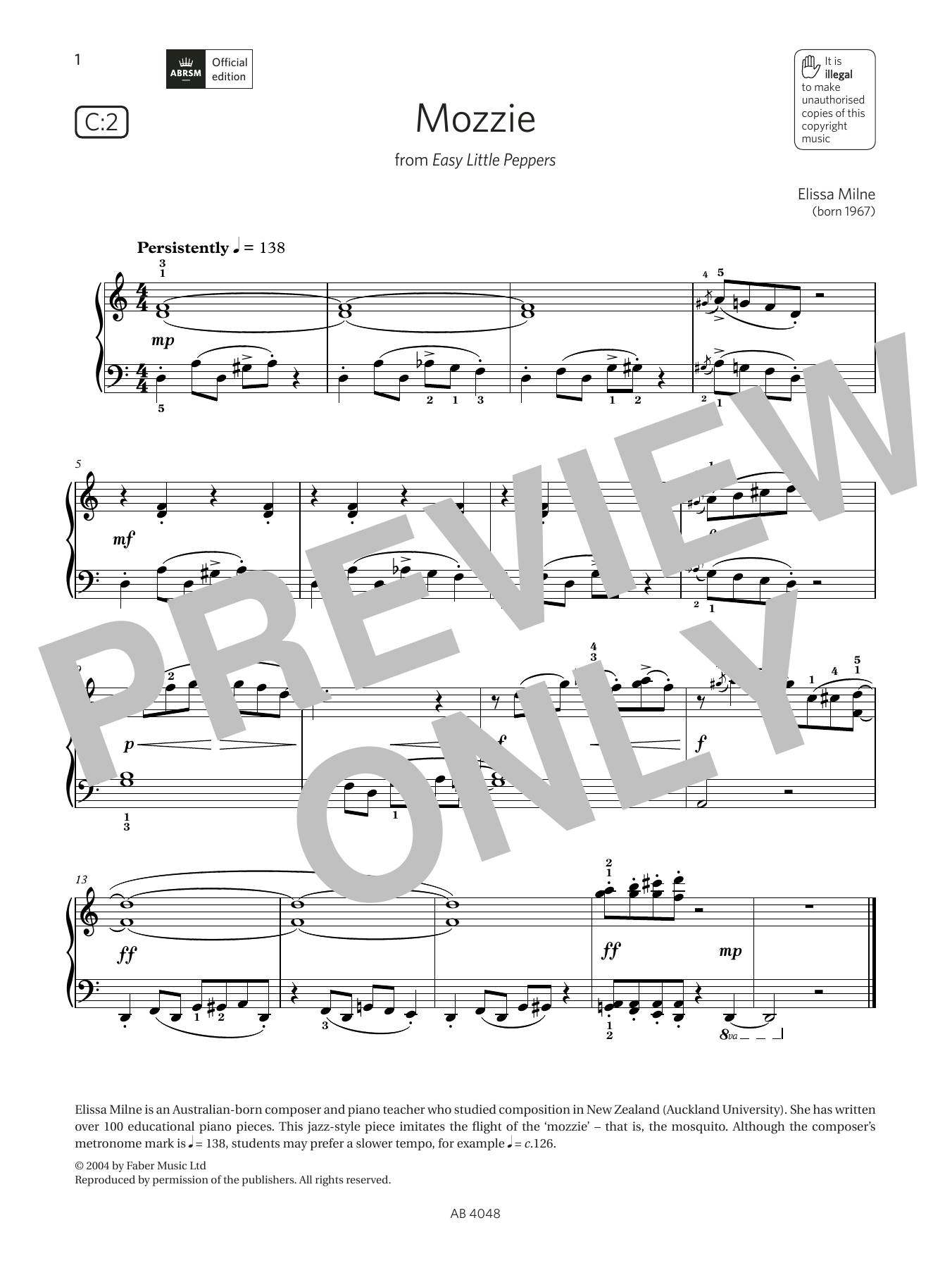 Download or print Elissa Milne Mozzie (Grade 2, list C2, from the ABRSM Piano Syllabus 2023 & 2024) sheet music, chords and digital score arranged for Piano Solo. This Classical score includes 1 page(s).