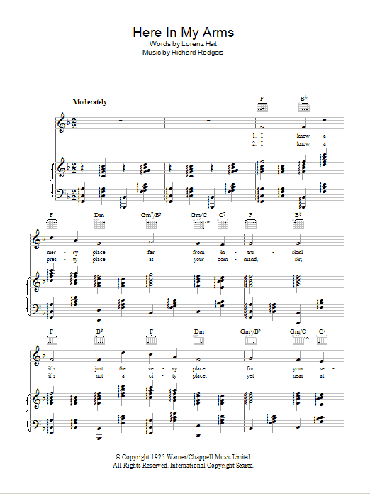 Download or print Ella Fitzgerald Here In My Arms sheet music, chords and digital score arranged for Piano, Vocal & Guitar Chords. This Jazz score includes 4 page(s).