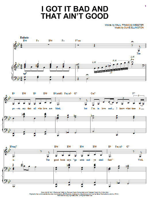 Download or print Ella Fitzgerald I Got It Bad And That Ain't Good sheet music, chords and digital score arranged for Piano & Vocal. This Blues score includes 7 page(s).