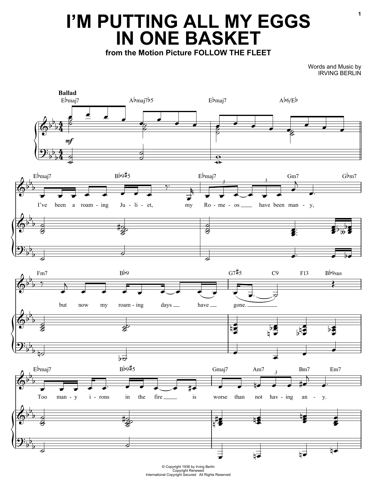 Download or print Ella Fitzgerald I'm Putting All My Eggs In One Basket sheet music, chords and digital score arranged for Piano & Vocal. This Film/TV score includes 8 page(s).