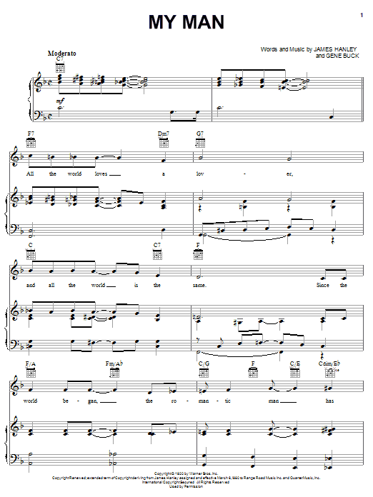 Download or print Ella Fitzgerald My Man sheet music, chords and digital score arranged for Piano, Vocal & Guitar Chords (Right-Hand Melody). This Musical/Show score includes 5 page(s).