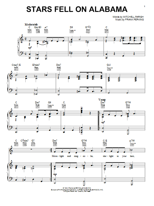 Download or print Ella Fitzgerald Stars Fell On Alabama sheet music, chords and digital score arranged for Piano, Vocal & Guitar Chords (Right-Hand Melody). This Blues score includes 4 page(s).