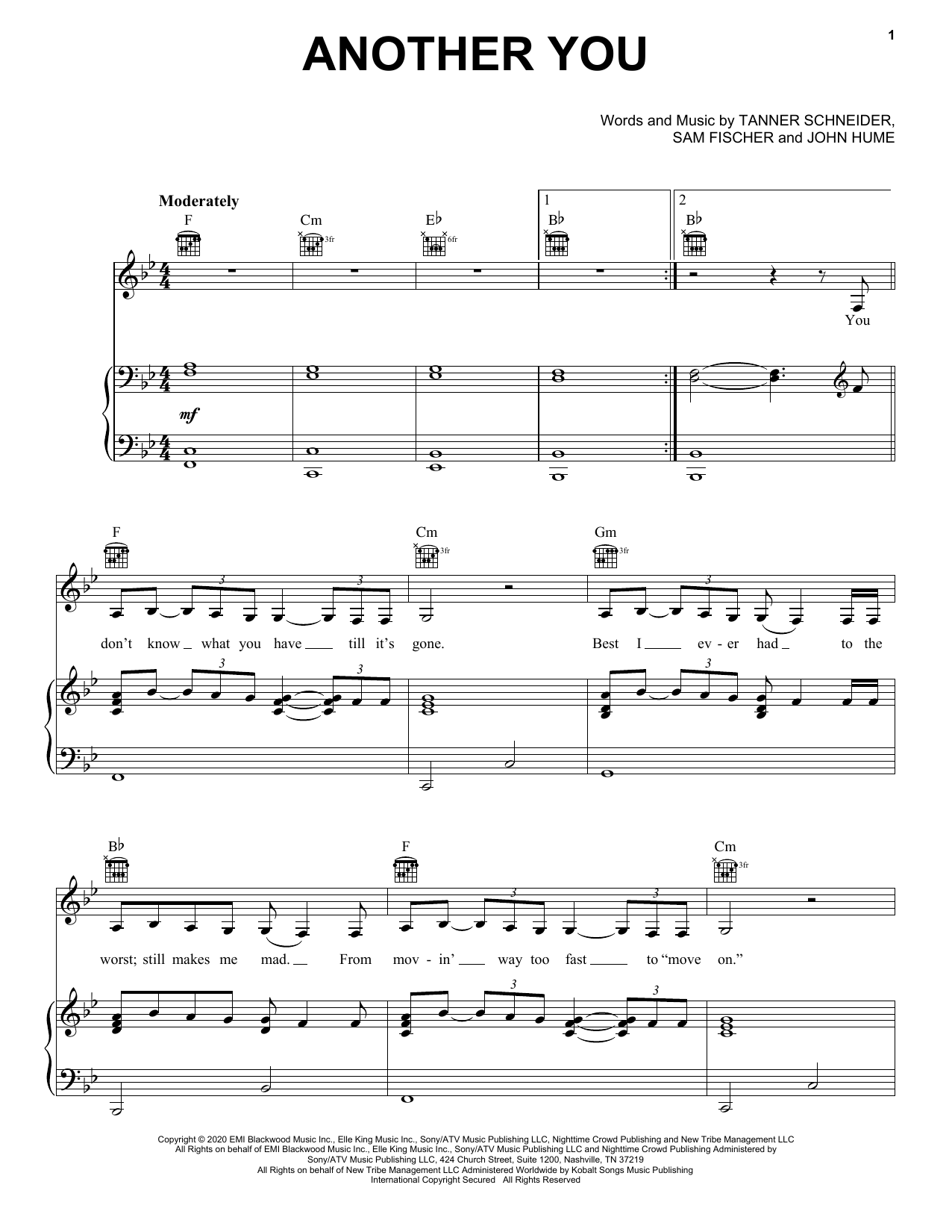 Download or print Elle King Another You sheet music, chords and digital score arranged for Piano, Vocal & Guitar Chords (Right-Hand Melody). This Pop score includes 7 page(s).