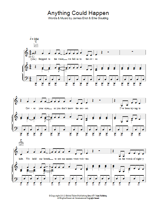 Download or print Ellie Goulding Anything Could Happen sheet music, chords and digital score arranged for Piano, Vocal & Guitar Chords. This Alternative score includes 6 page(s).