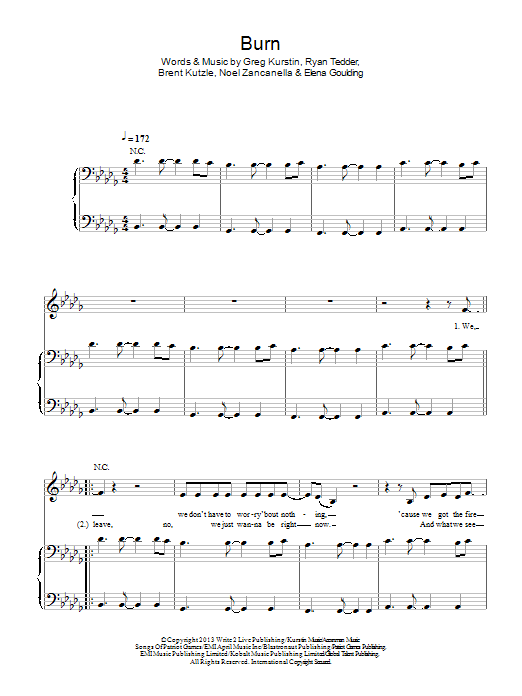 Download or print Ellie Goulding Burn sheet music, chords and digital score arranged for Piano, Vocal & Guitar Chords (Right-Hand Melody). This Pop score includes 11 page(s).