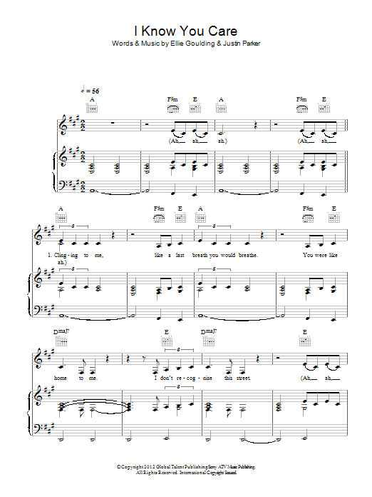 Download or print Ellie Goulding I Know You Care sheet music, chords and digital score arranged for Piano, Vocal & Guitar Chords. This Alternative score includes 5 page(s).