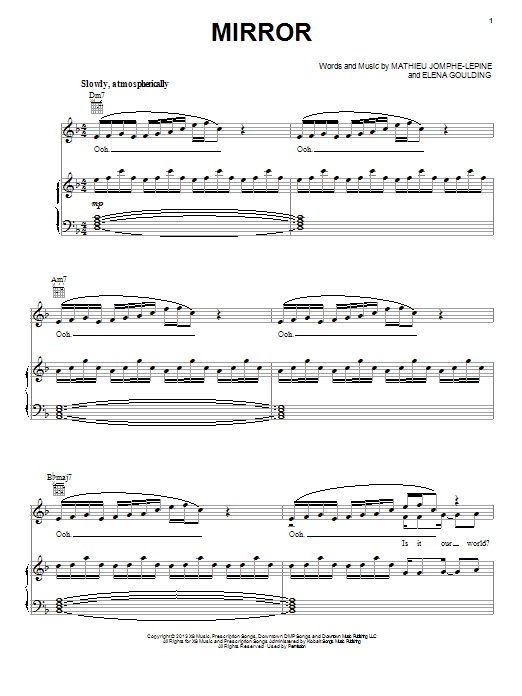 Download or print Ellie Goulding Mirror sheet music, chords and digital score arranged for Piano, Vocal & Guitar Chords (Right-Hand Melody). This Film/TV score includes 8 page(s).
