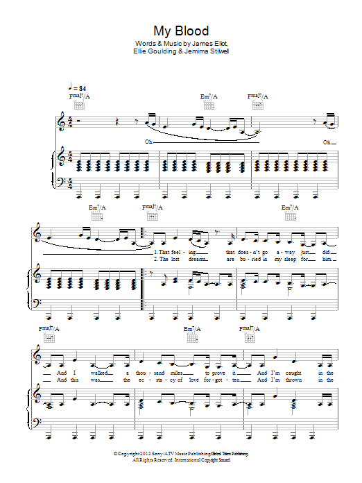 Download or print Ellie Goulding My Blood sheet music, chords and digital score arranged for Piano, Vocal & Guitar Chords. This Alternative score includes 6 page(s).