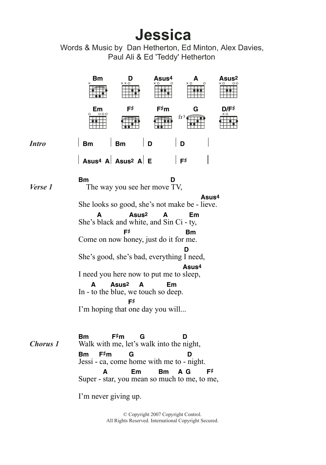 Download or print Elliot Minor Jessica sheet music, chords and digital score arranged for Guitar Chords/Lyrics. This Rock score includes 2 page(s).