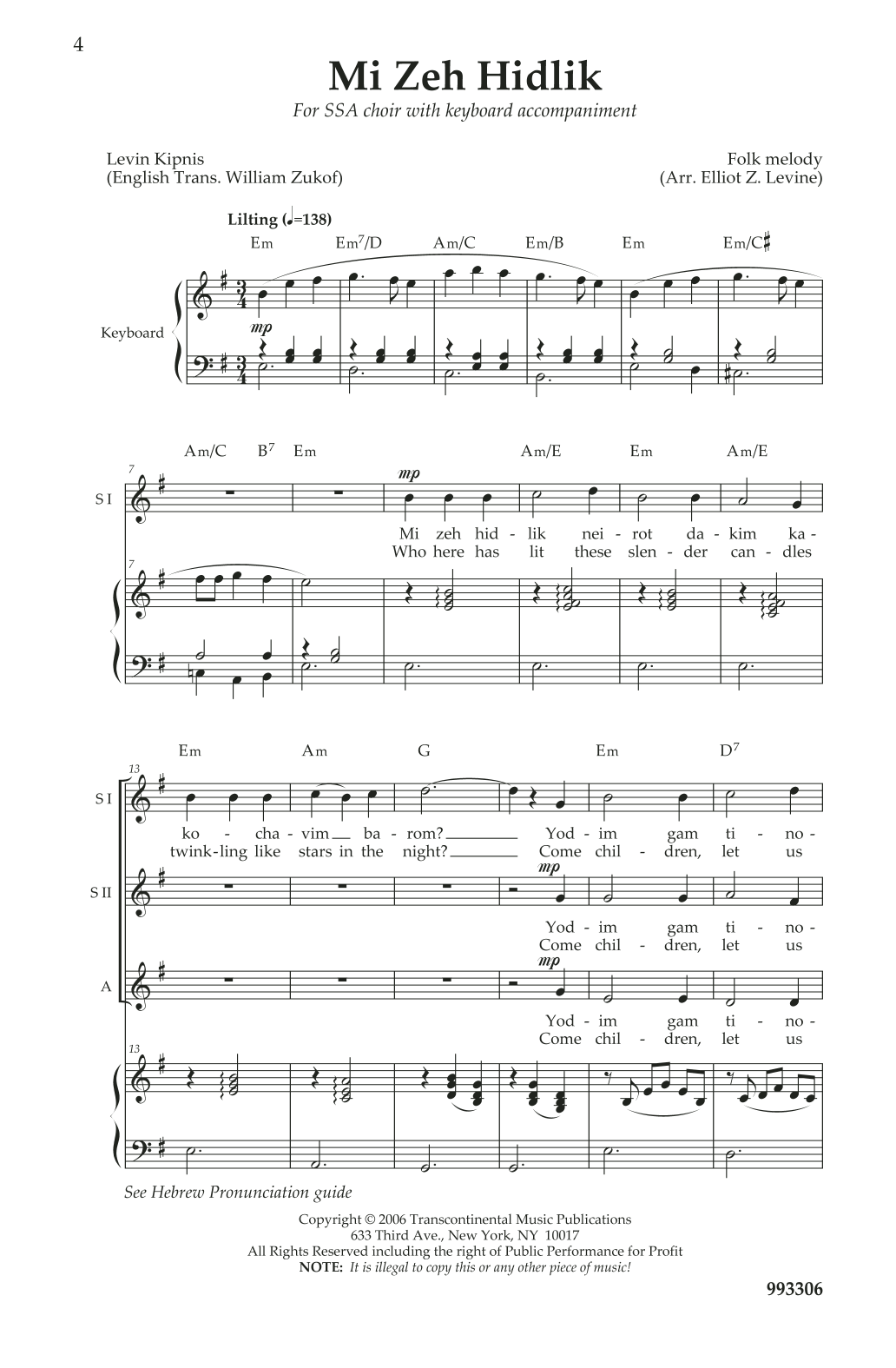 Download or print Elliot Z. Levine Three Yiddish Chanukah Songs For Treble Choir sheet music, chords and digital score arranged for SSA Choir. This Chanukah score includes 19 page(s).