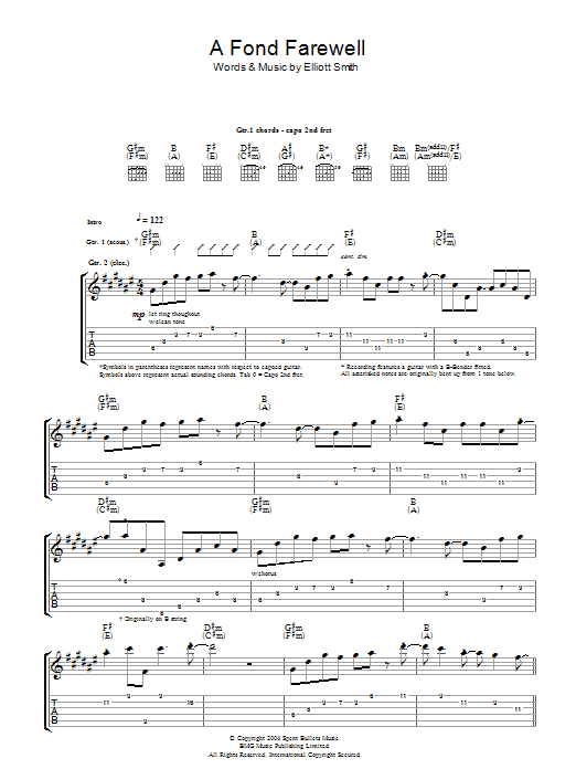 Download or print Elliott Smith A Fond Farewell sheet music, chords and digital score arranged for Guitar Tab. This Rock score includes 5 page(s).