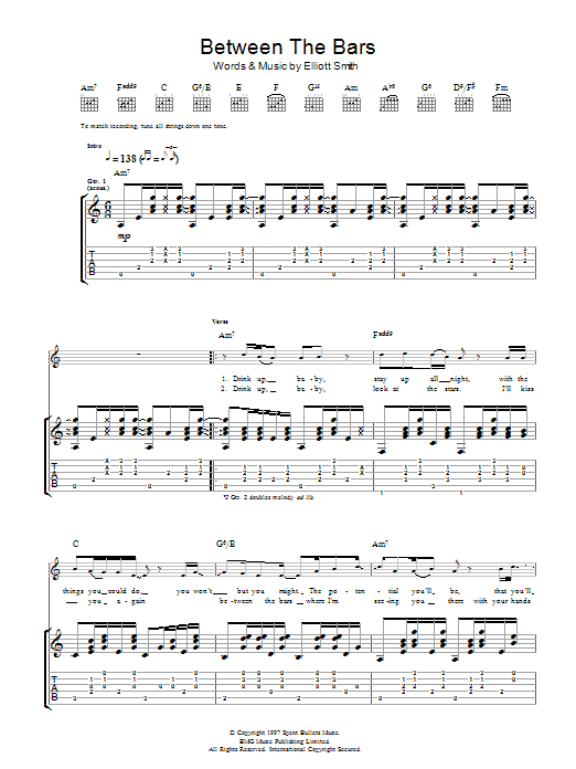 Download or print Elliott Smith Between The Bars sheet music, chords and digital score arranged for Guitar Tab. This Rock score includes 3 page(s).