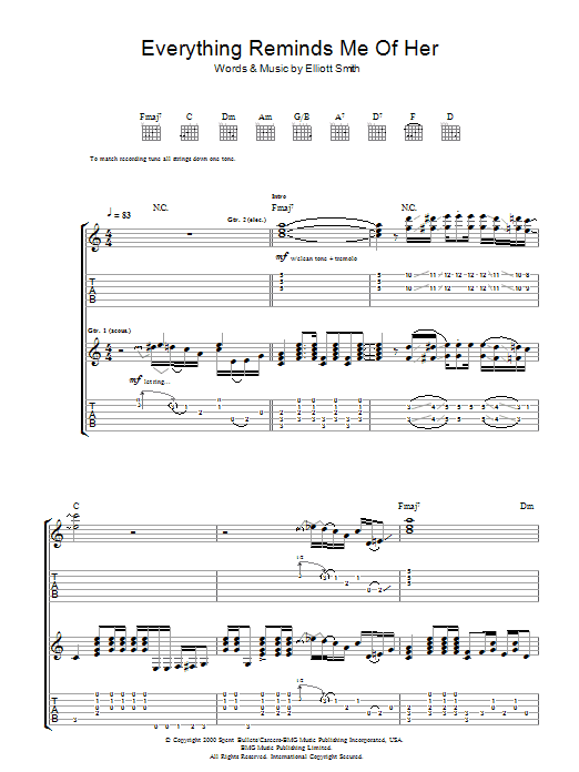 Download or print Elliott Smith Everything Reminds Me Of Her sheet music, chords and digital score arranged for Guitar Tab. This Rock score includes 6 page(s).