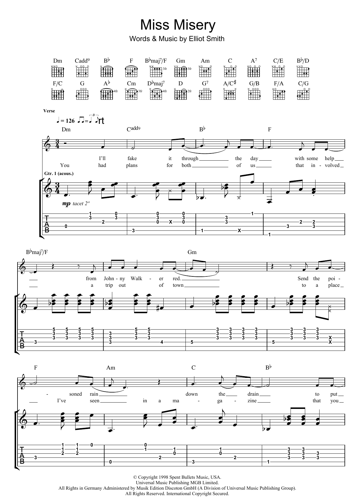Download or print Elliott Smith Miss Misery sheet music, chords and digital score arranged for Super Easy Piano. This Film/TV score includes 2 page(s).