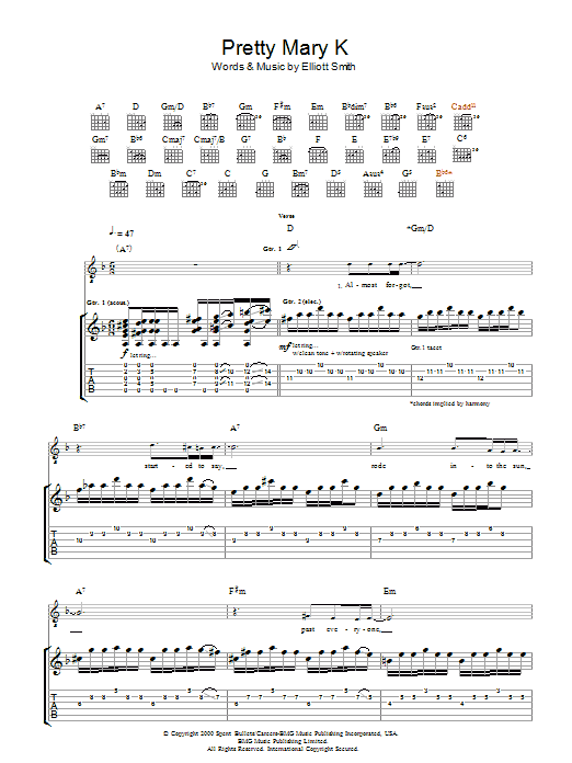 Download or print Elliott Smith Pretty Mary K sheet music, chords and digital score arranged for Guitar Tab. This Rock score includes 5 page(s).