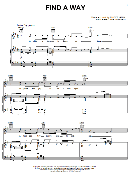 Download or print Elliott Yamin Find A Way sheet music, chords and digital score arranged for Piano, Vocal & Guitar Chords (Right-Hand Melody). This Pop score includes 6 page(s).