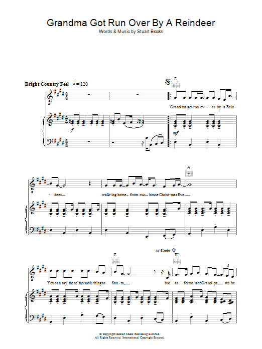 Download or print Elmo and Patsy Grandma Got Run Over By A Reindeer sheet music, chords and digital score arranged for Piano, Vocal & Guitar Chords. This Christmas score includes 3 page(s).