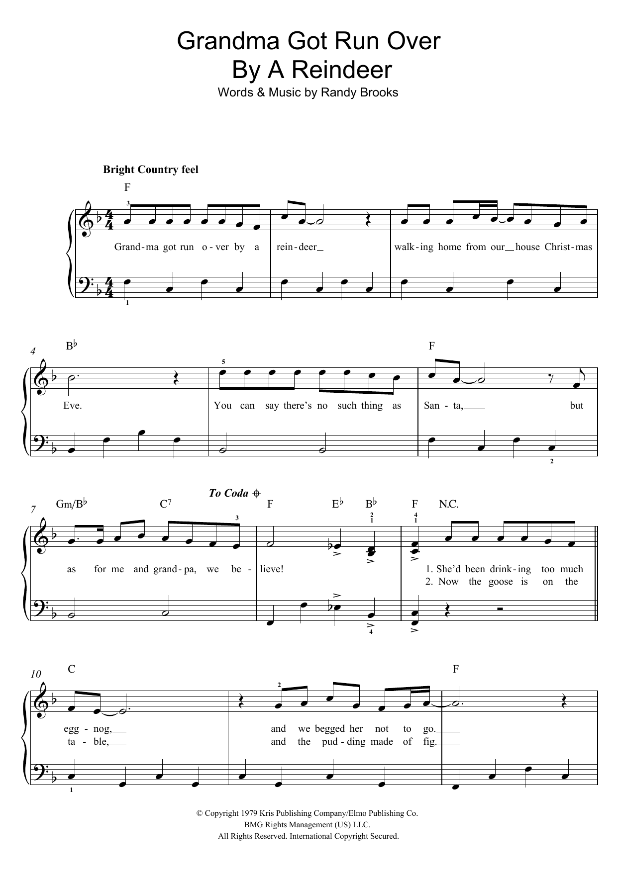 Download or print Elmo & Patsy Grandma Got Run Over By A Reindeer sheet music, chords and digital score arranged for Beginner Piano (Abridged). This Christmas score includes 2 page(s).