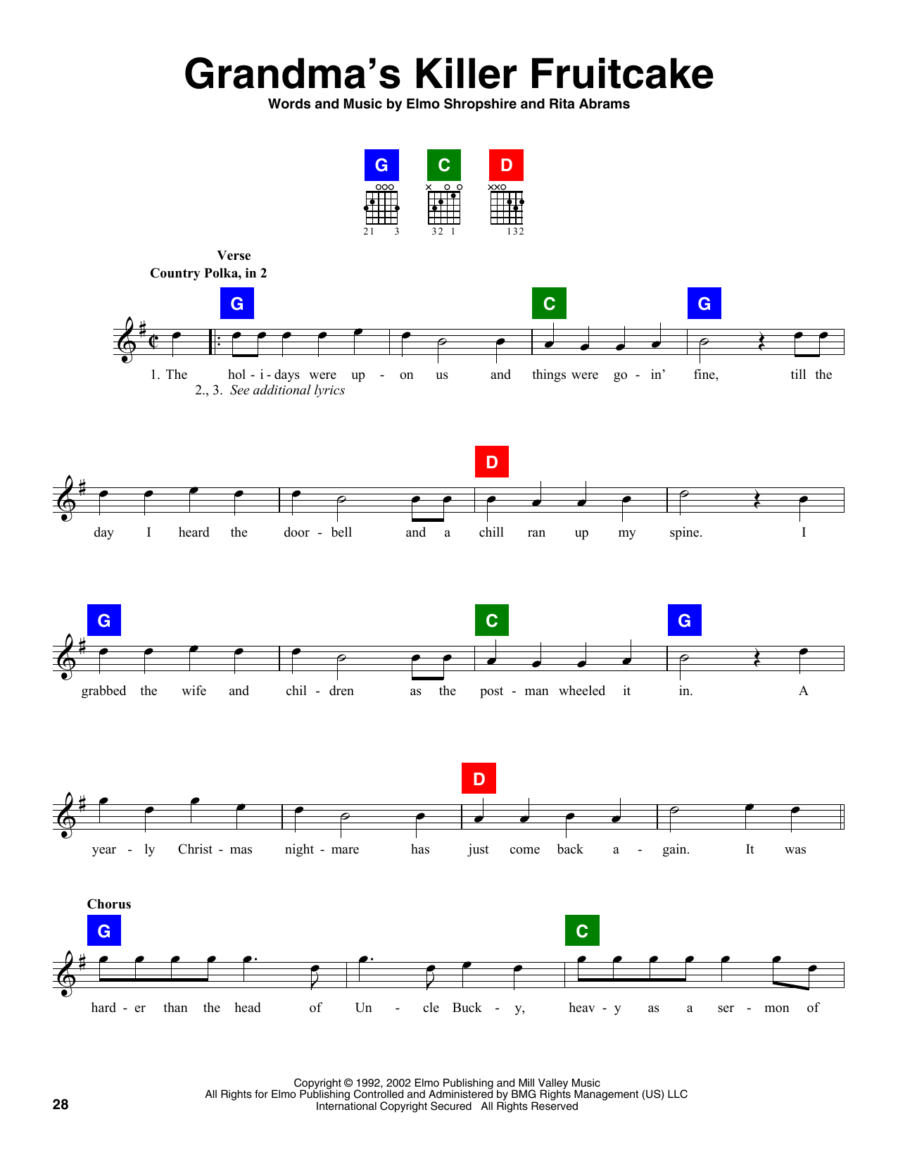 Download or print Elmo Shropshire Grandma's Killer Fruitcake sheet music, chords and digital score arranged for Easy Guitar. This Children score includes 2 page(s).
