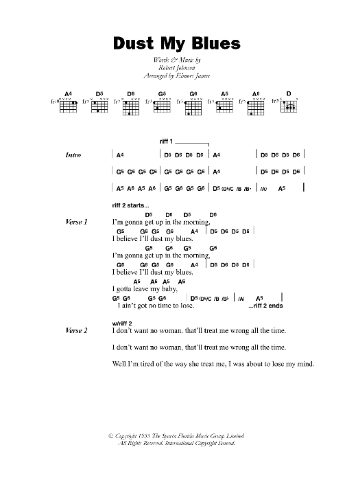 Download or print Elmore James Dust My Blues sheet music, chords and digital score arranged for Guitar Chords/Lyrics. This Blues score includes 2 page(s).