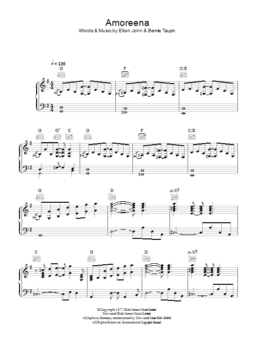 Download or print Elton John Amoreena sheet music, chords and digital score arranged for Guitar Chords/Lyrics. This Pop score includes 2 page(s).