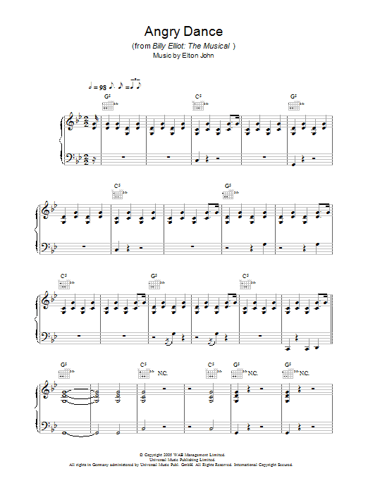 Download or print Elton John Angry Dance sheet music, chords and digital score arranged for Piano, Vocal & Guitar Chords. This Musical/Show score includes 7 page(s).