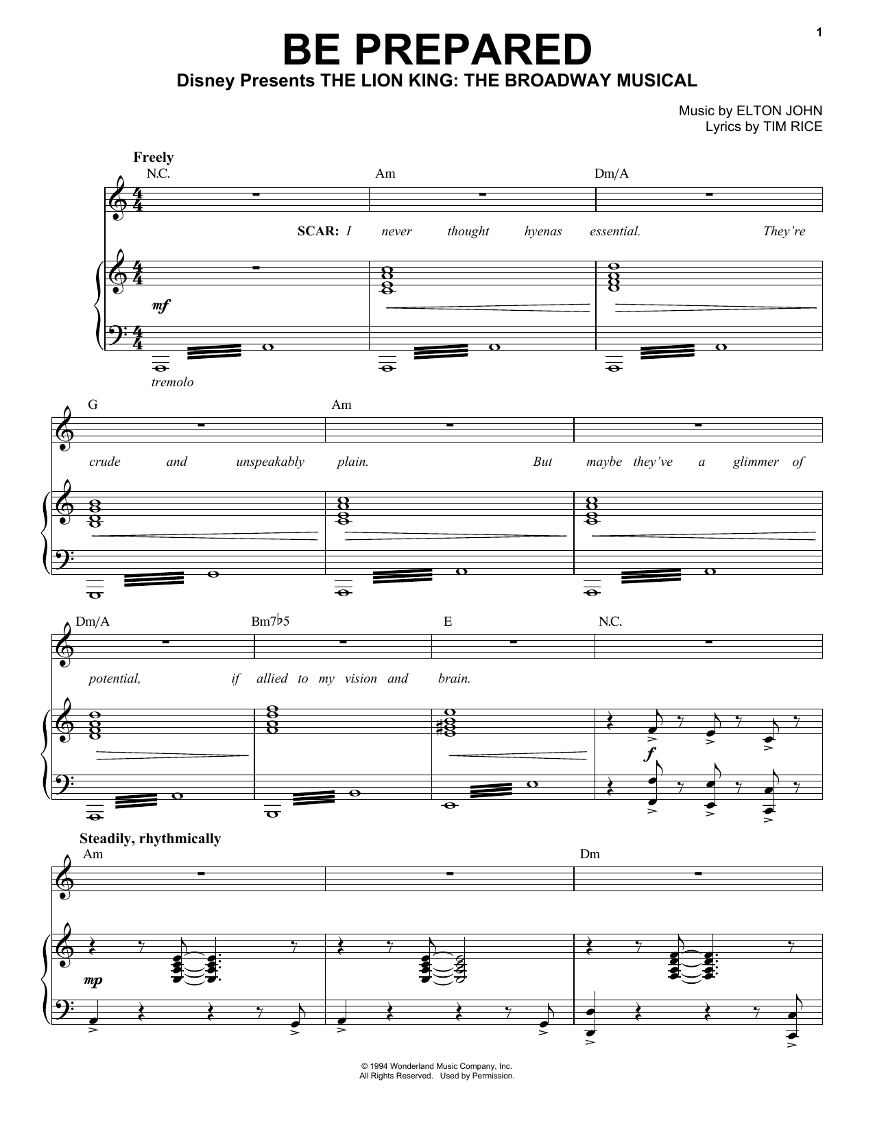 Download or print Elton John Be Prepared (from The Lion King: Broadway Musical) sheet music, chords and digital score arranged for Easy Piano. This Disney score includes 10 page(s).