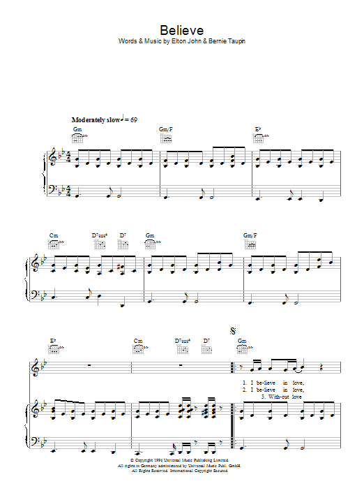 Download or print Elton John Believe sheet music, chords and digital score arranged for Really Easy Piano. This Pop score includes 3 page(s).