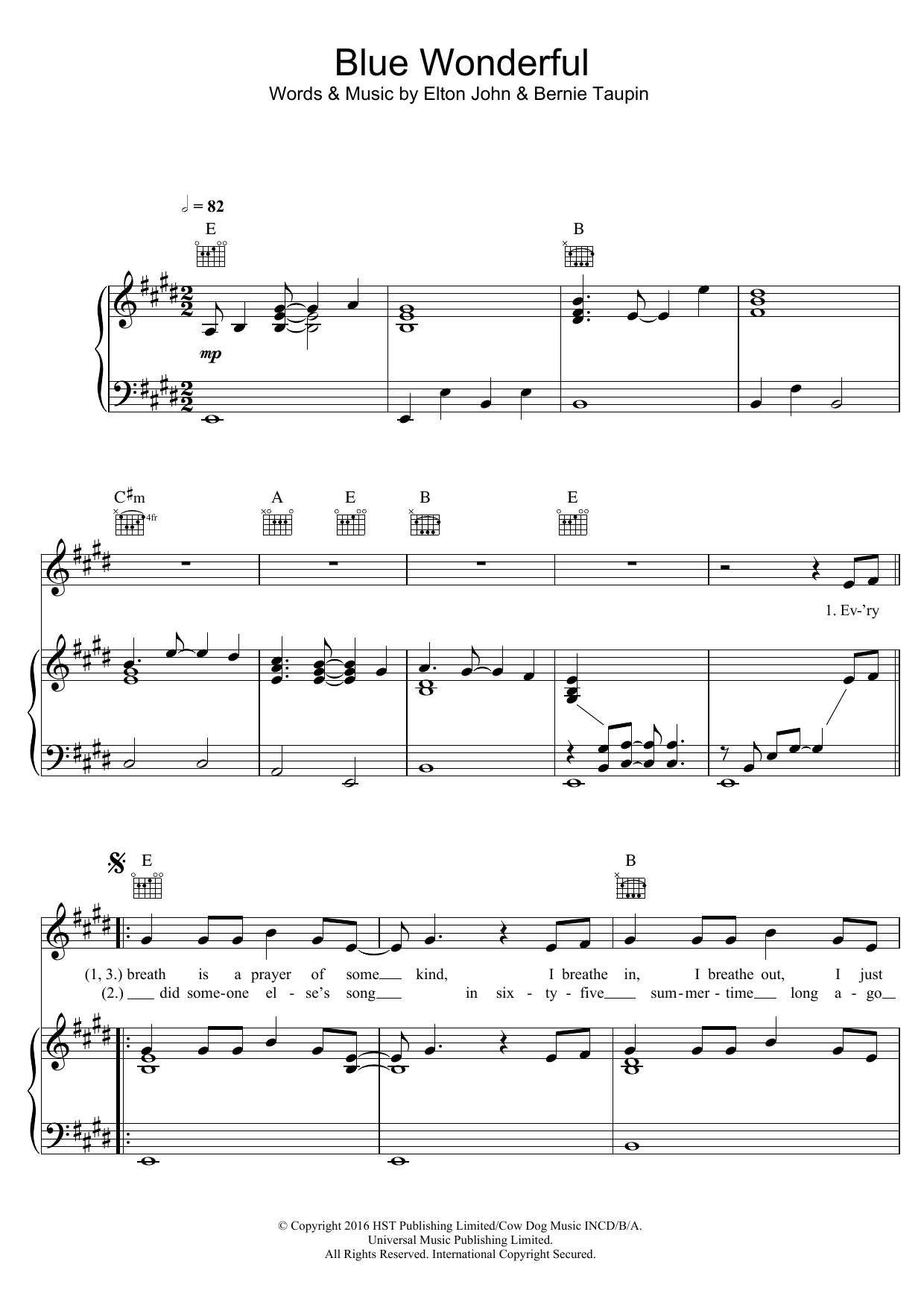 Download or print Elton John Blue Wonderful sheet music, chords and digital score arranged for Piano, Vocal & Guitar Chords. This Pop score includes 7 page(s).