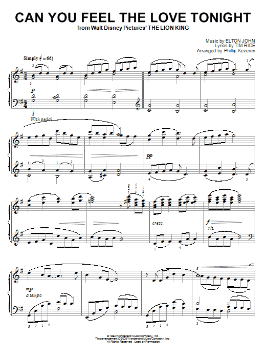 Quick facts Can You Feel The Love Tonight [Classical version] (from The Lion King) (arr. Phillip Keveren) about digital sheet music