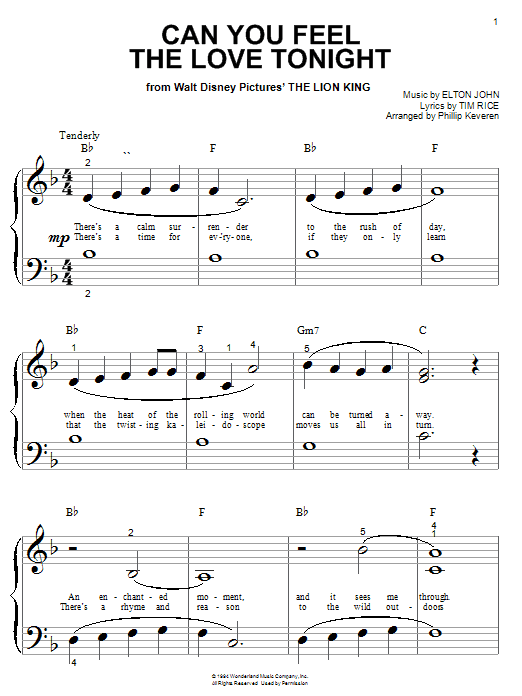 Download or print Elton John Can You Feel The Love Tonight (from The Lion King) (arr. Phillip Keveren) sheet music, chords and digital score arranged for Piano Solo. This Disney score includes 5 page(s).