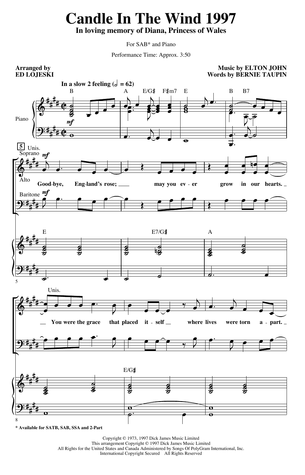 Download or print Elton John Candle In The Wind (arr. Ed Lojeski) sheet music, chords and digital score arranged for SSA Choir. This Pop score includes 10 page(s).