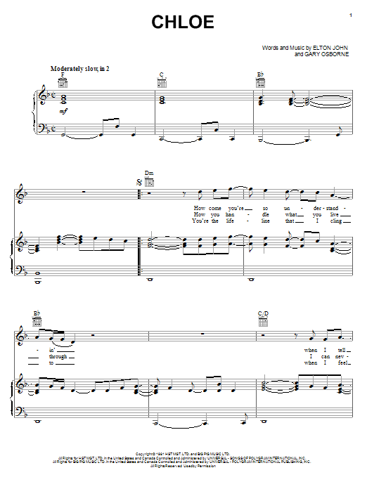 Download or print Elton John Chloe sheet music, chords and digital score arranged for Guitar Chords/Lyrics. This Pop score includes 2 page(s).