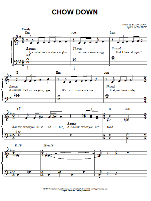 Download or print Elton John Chow Down (from The Lion King: Broadway Musical) sheet music, chords and digital score arranged for Vocal Duet. This Disney score includes 6 page(s).