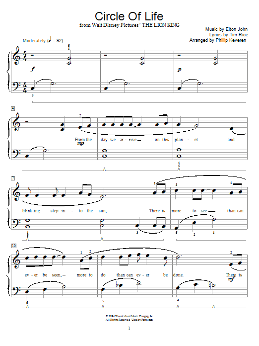 Quick facts Circle Of Life (from The Lion King) (arr. Phillip Keveren) about digital sheet music