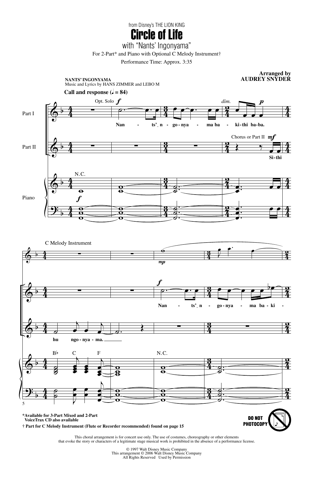 Quick facts Circle Of Life (with Nants' Ingonyama) (from The Lion King) (Arr. Audrey Snyder) about digital sheet music