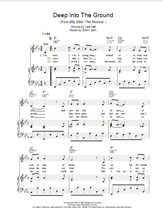 Download or print Elton John Deep Into The Ground (from Billy Elliot: The Musical) sheet music, chords and digital score arranged for Easy Piano. This Broadway score includes 4 page(s).