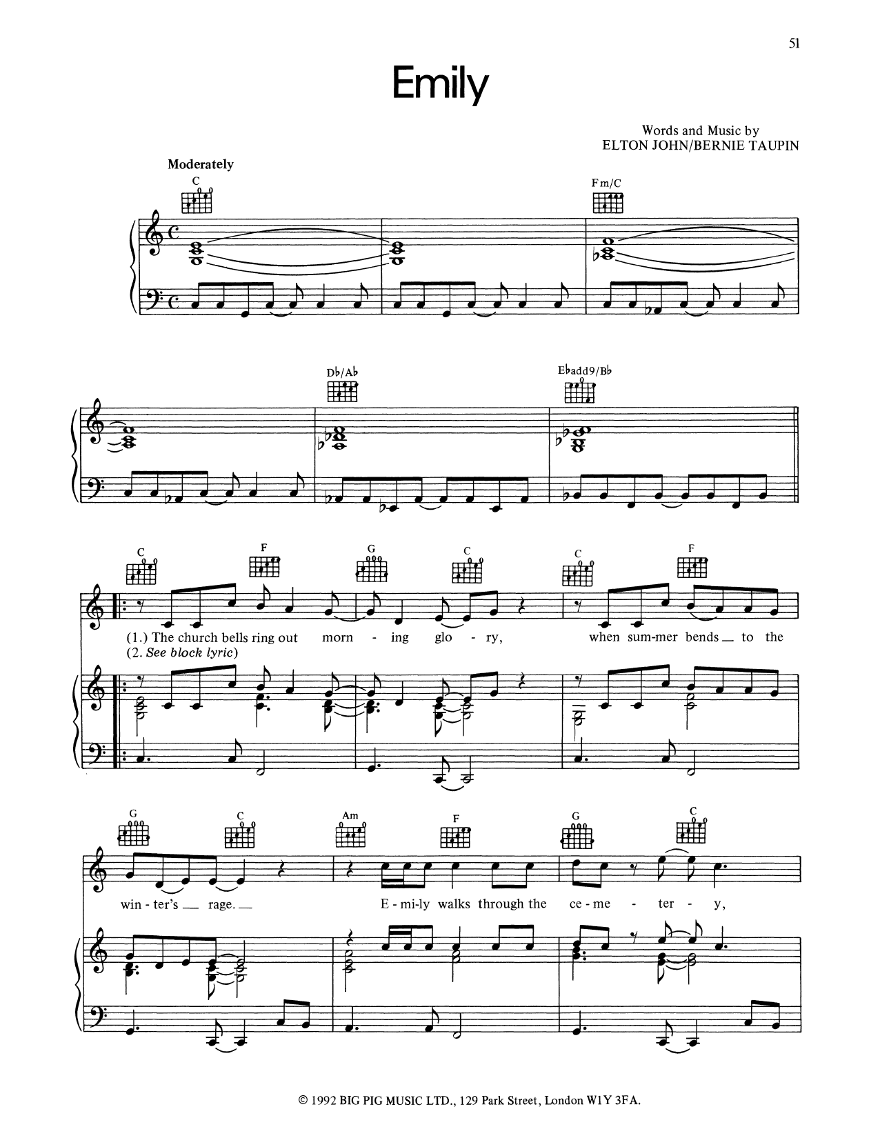Download or print Elton John Emily sheet music, chords and digital score arranged for Piano, Vocal & Guitar Chords (Right-Hand Melody). This Pop score includes 4 page(s).