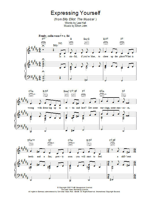 Download or print Elton John Expressing Yourself sheet music, chords and digital score arranged for Easy Piano. This Musical/Show score includes 4 page(s).