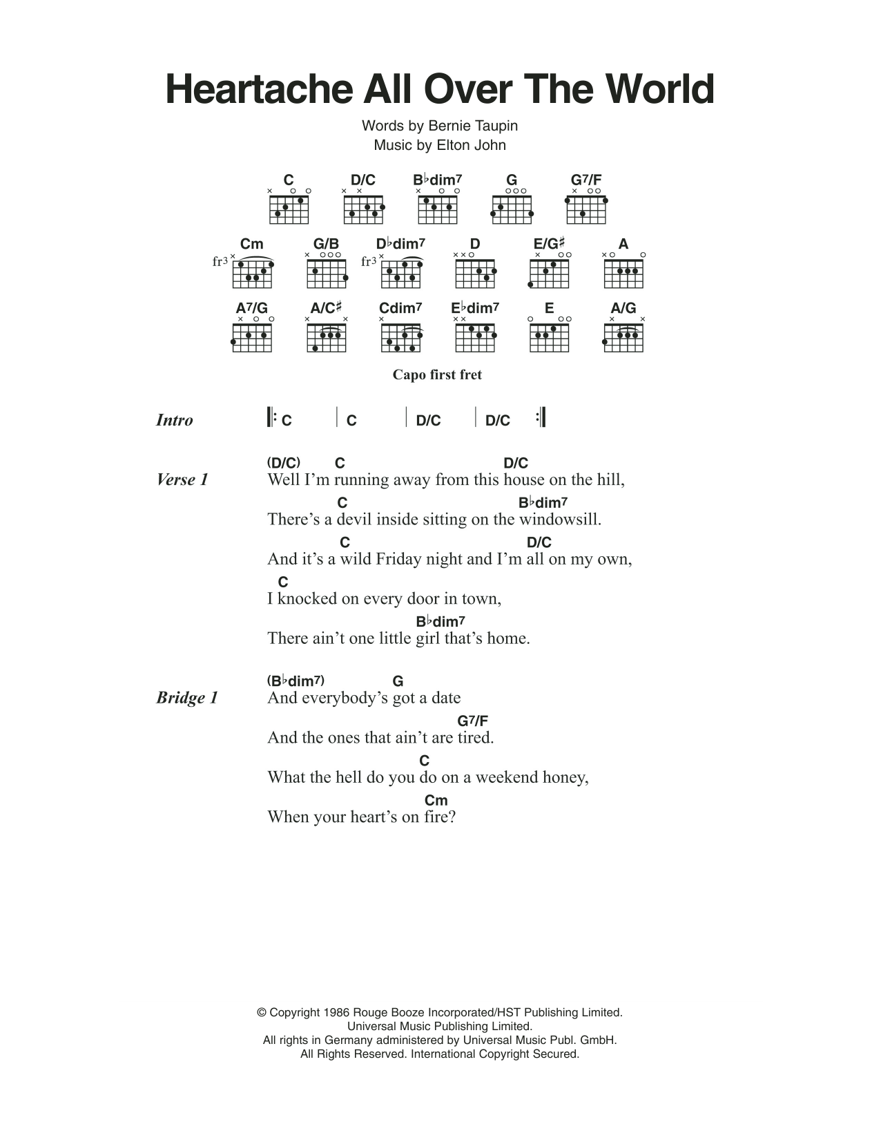 Download or print Elton John Heartaches All Over The World sheet music, chords and digital score arranged for Guitar Chords/Lyrics. This Pop score includes 3 page(s).