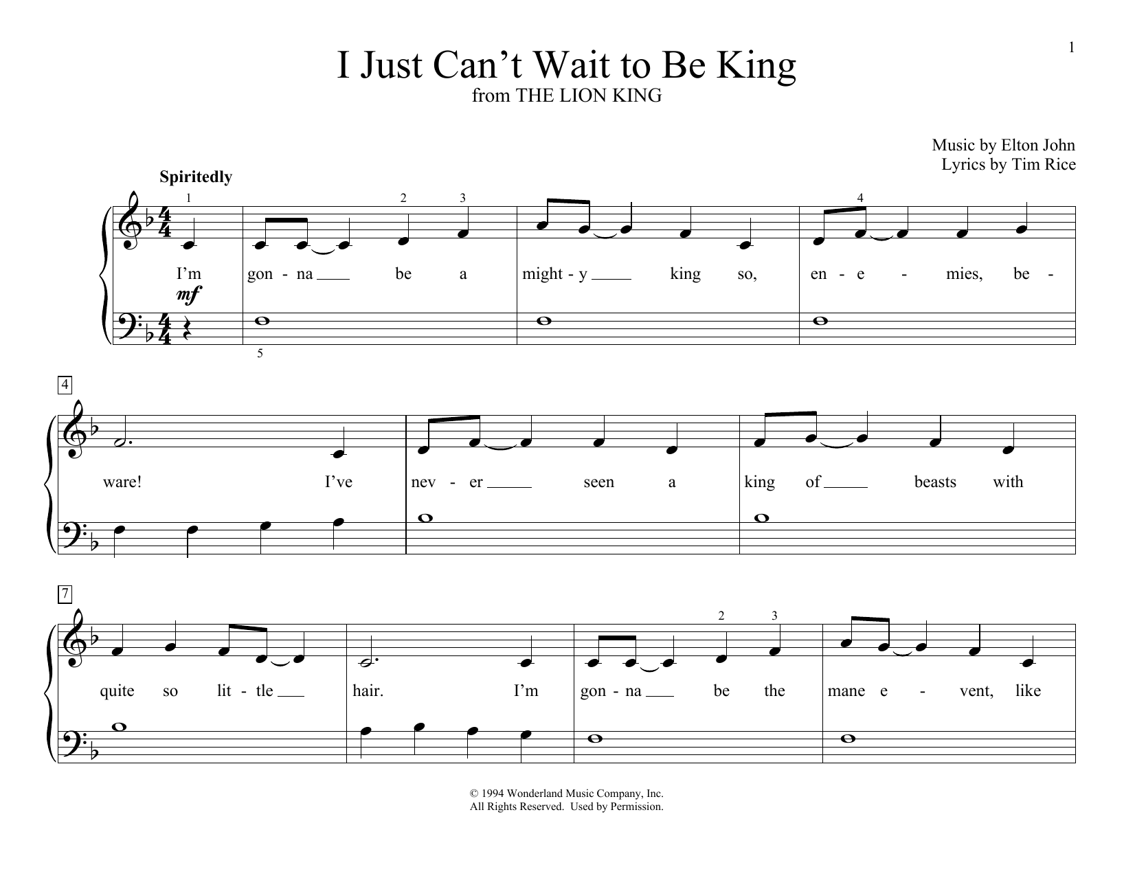 Download or print Elton John I Just Can't Wait To Be King (from The Lion King) (arr. Christopher Hussey) sheet music, chords and digital score arranged for Educational Piano. This Children score includes 2 page(s).