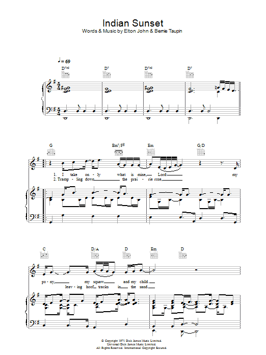 Download or print Elton John Indian Sunset sheet music, chords and digital score arranged for Piano, Vocal & Guitar Chords (Right-Hand Melody). This Pop score includes 11 page(s).