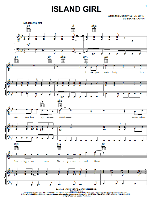 Download or print Elton John Island Girl sheet music, chords and digital score arranged for Piano, Vocal & Guitar Chords. This Pop score includes 7 page(s).