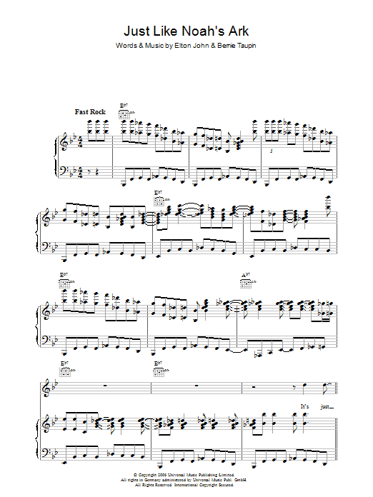 Download or print Elton John Just Like Noah's Ark sheet music, chords and digital score arranged for Piano, Vocal & Guitar Chords (Right-Hand Melody). This Pop score includes 11 page(s).