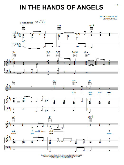 Download or print Elton John & Leon Russell In The Hands Of Angels sheet music, chords and digital score arranged for Piano, Vocal & Guitar Chords (Right-Hand Melody). This Pop score includes 7 page(s).