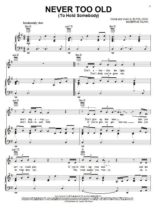 Download or print Elton John & Leon Russell Never Too Old (To Hold Somebody) sheet music, chords and digital score arranged for Easy Piano. This Pop score includes 6 page(s).