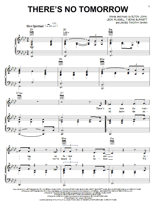 Download or print Elton John & Leon Russell There's No Tomorrow sheet music, chords and digital score arranged for Piano, Vocal & Guitar Chords. This Pop score includes 5 page(s).