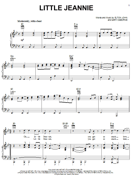 Download or print Elton John Little Jeannie sheet music, chords and digital score arranged for Piano, Vocal & Guitar Chords. This Pop score includes 5 page(s).